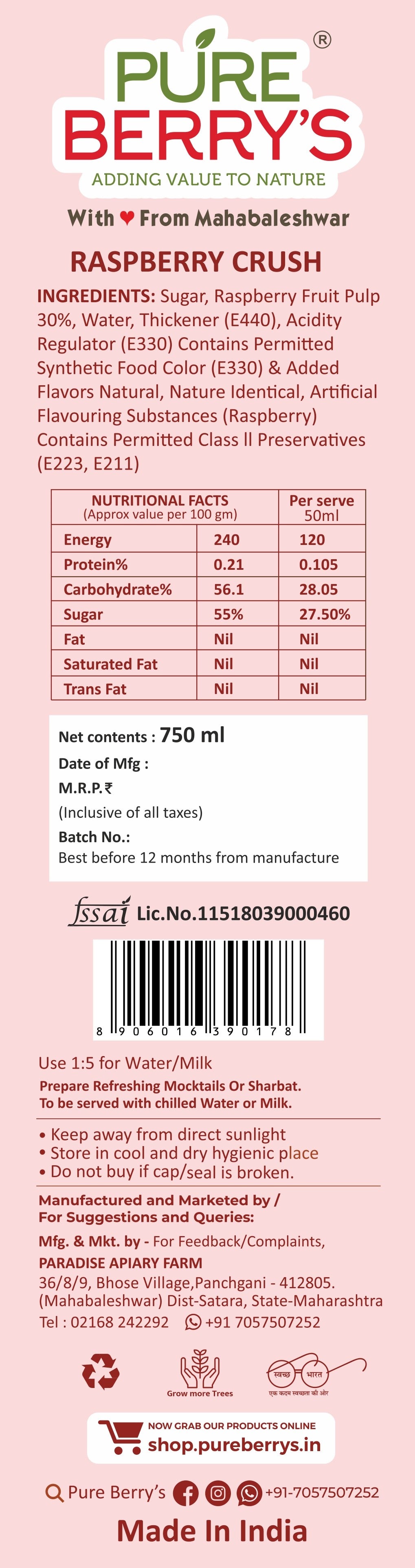 - Made with original raspberry pulp- Contains High fruits - Ideal for making Milk Shakes, Lassis, Faloodas, Cakes, Ice Cream etc.- Also used for making mocktails, cocktails, sharbat, slushes and refreshing drinks.